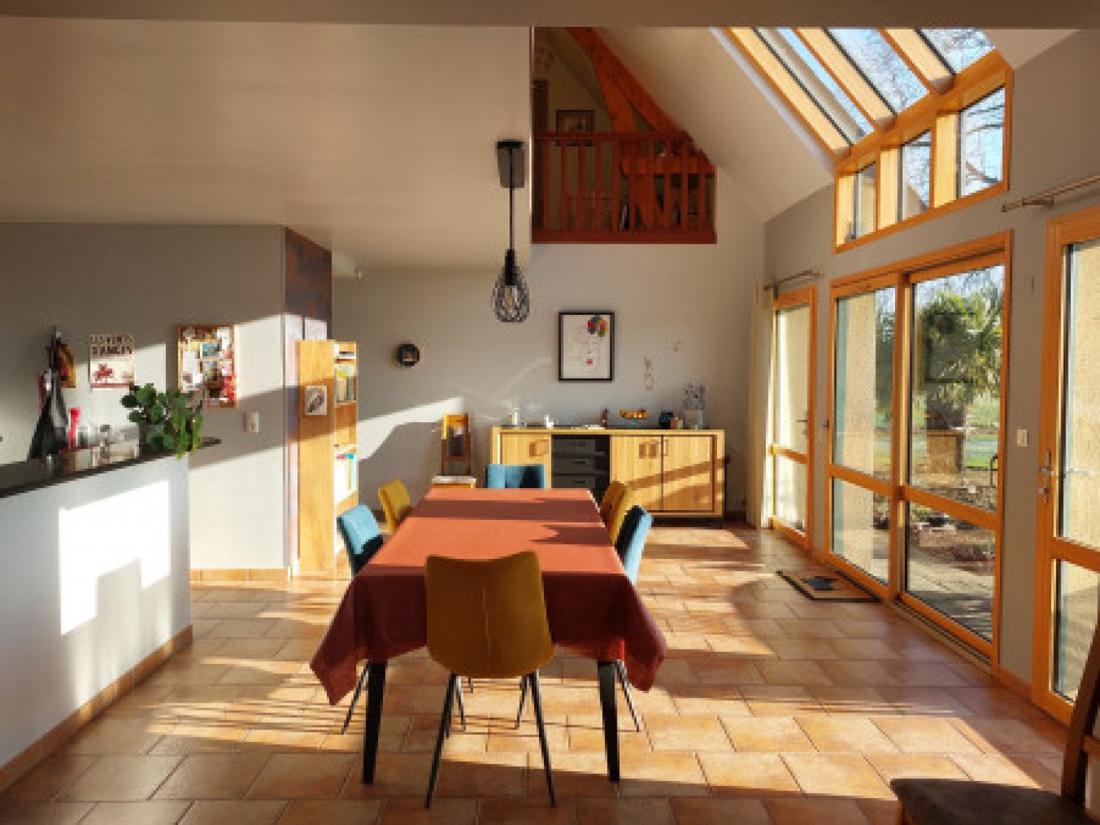 Entrée, wc, cellier, salle à manger et salon de plus de 70M², cuisine ouverte équipée et aménagée Schmitt. Le tout est ouvert par de grandes verrières sur une magnifique terrasse sud avec store et volet électrique